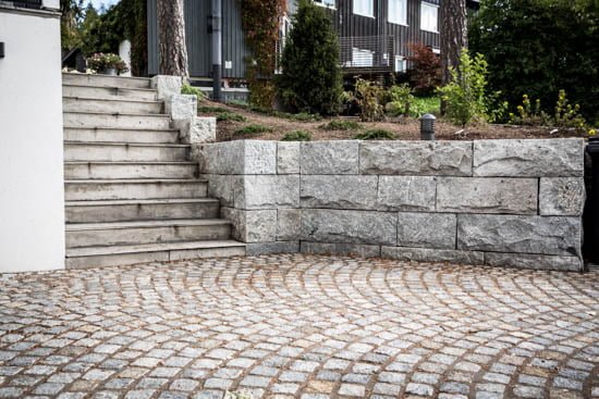Ved inngangen og garasjen til huset har vi lagt brosten i klassiske mønstre og bygget murer som rammer inn området på en flott måte.